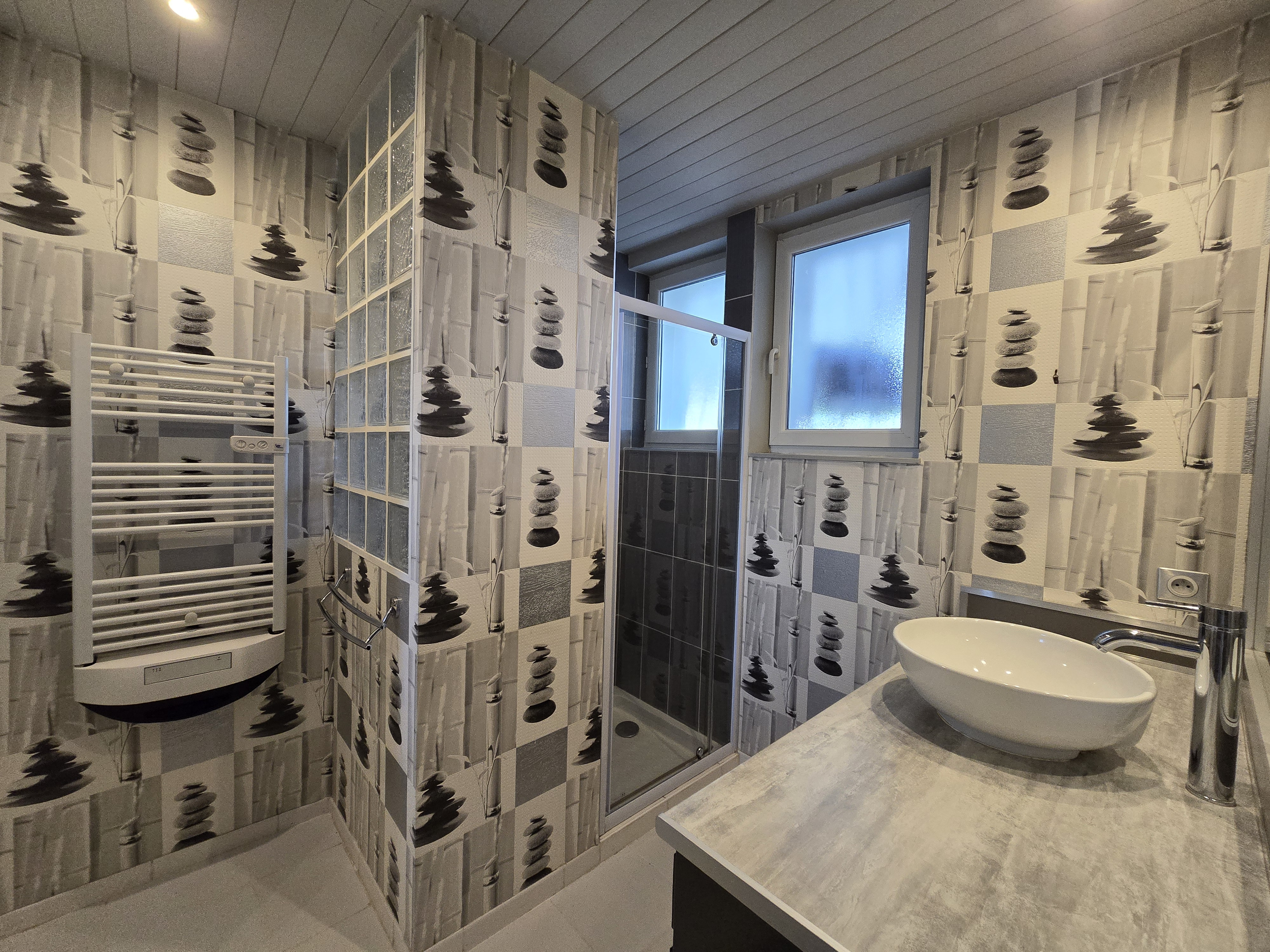 Au rez-de-chaussée, un appartement indépendant propose un salon, une cuisine séparée, une salle d’eau, un WC ainsi qu’un garage. Cet espace peut facilement être utilisé comme logement supplémentaire ou transformé selon vos besoins.