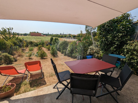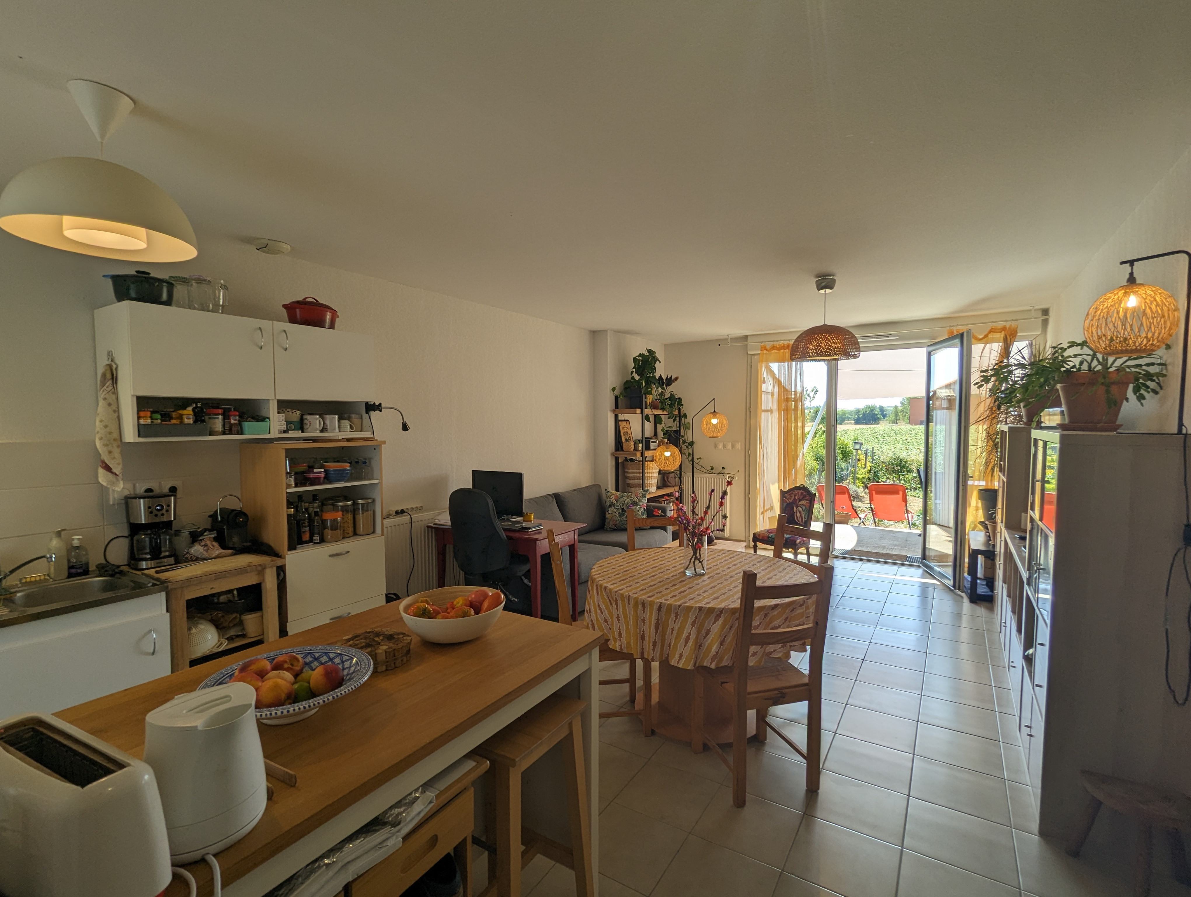 Une pièce de vie lumineuse ouverte sur une grande baie vitrée donnant accès direct à la terrasse et au jardin.