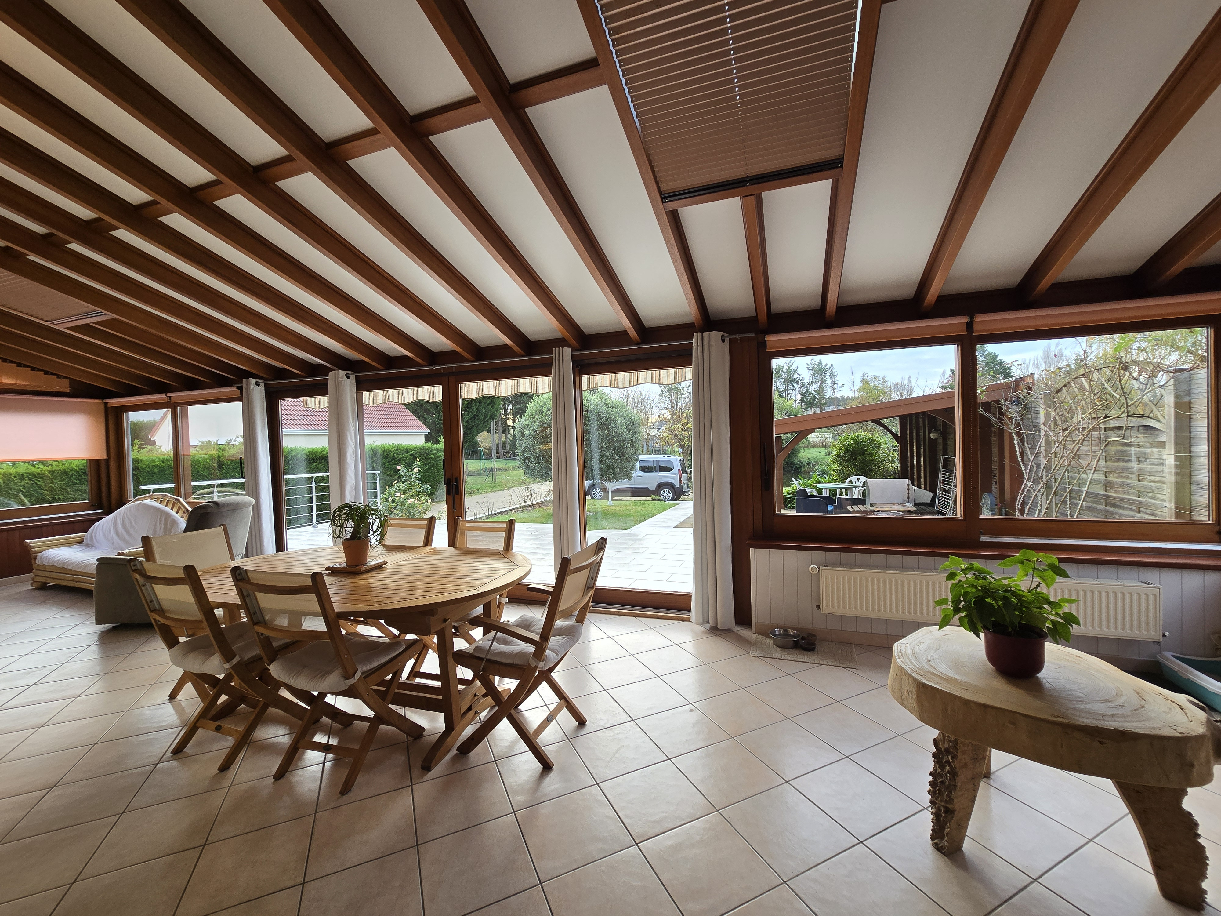 Dès l’entrée, vous découvrirez un agréable salon avec sa cheminée avec insert, idéal pour des soirées chaleureuses. La cuisine séparée est fonctionnelle et bien pensée. Vous disposerez également, au rez-de-chaussée, d’un bureau (ou d’une chambre selon vos besoins), d'un WC et d’une magnifique pièce de vie supplémentaire de type véranda, d’environ 44 m², de très belle qualité, ouverte sur la terrasse et baignée de lumière.