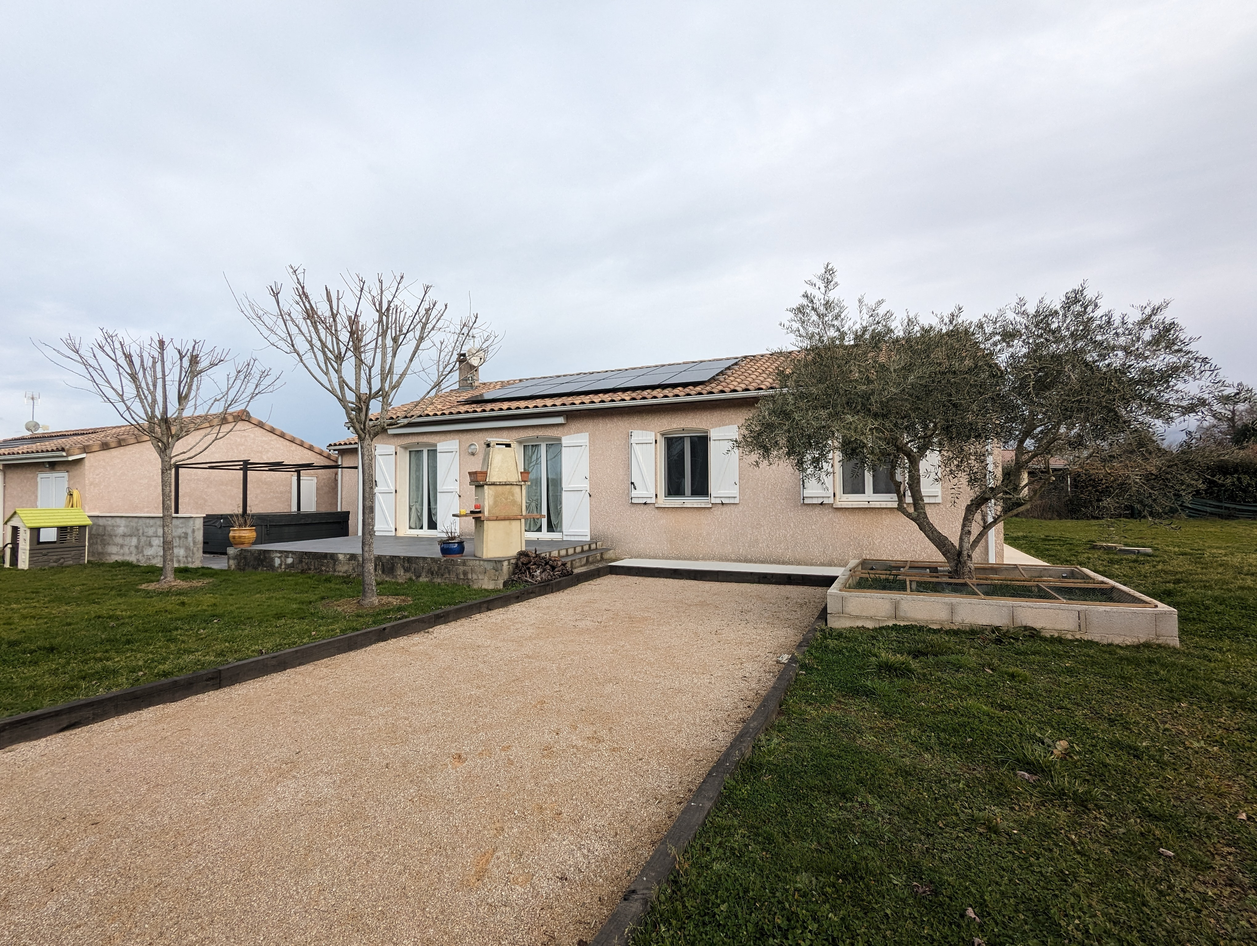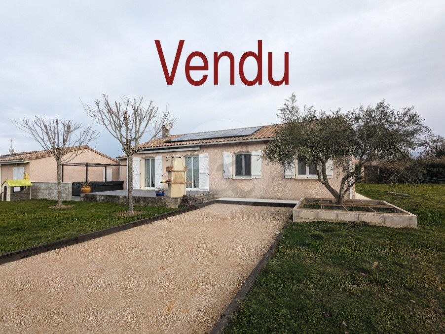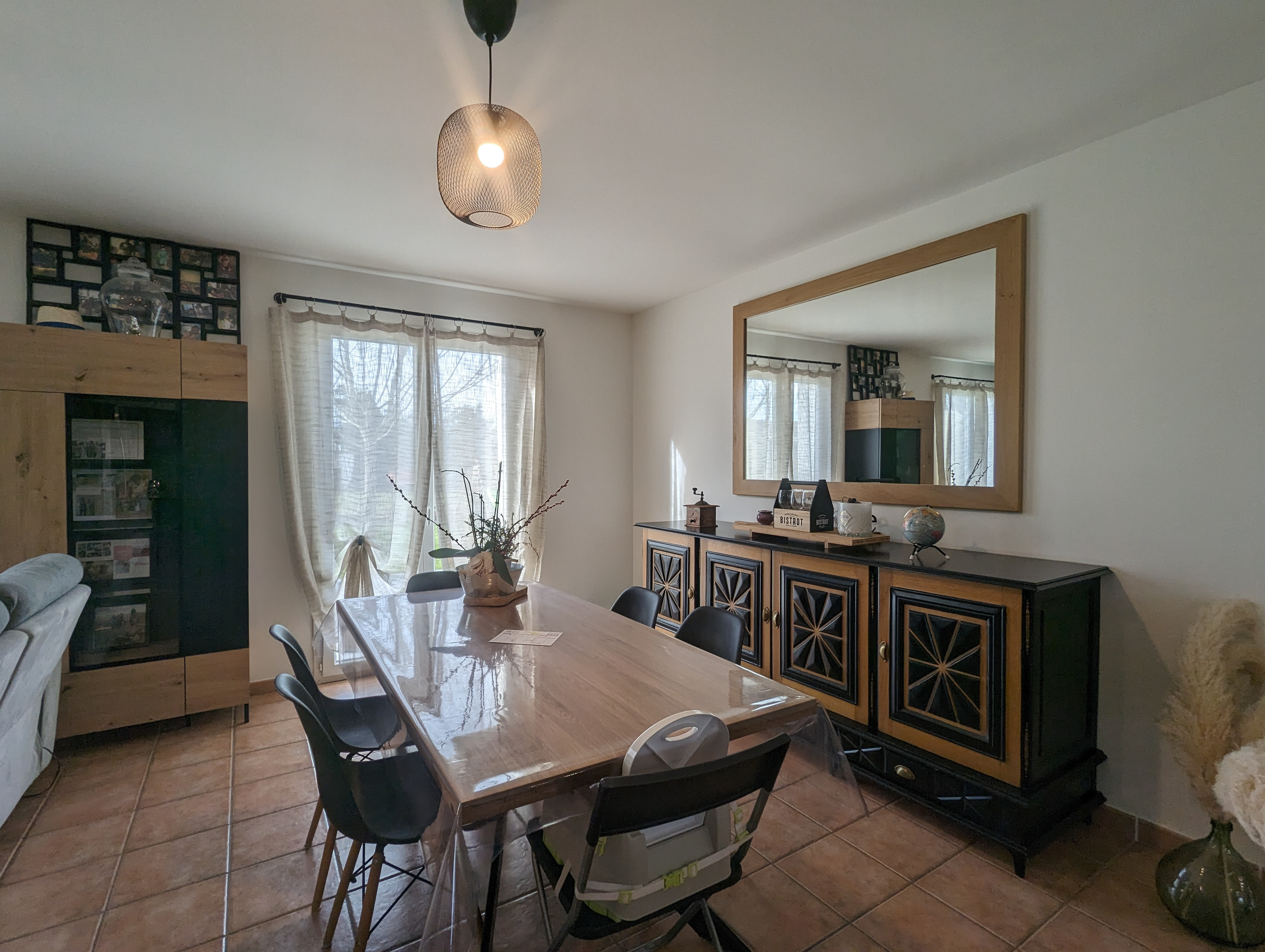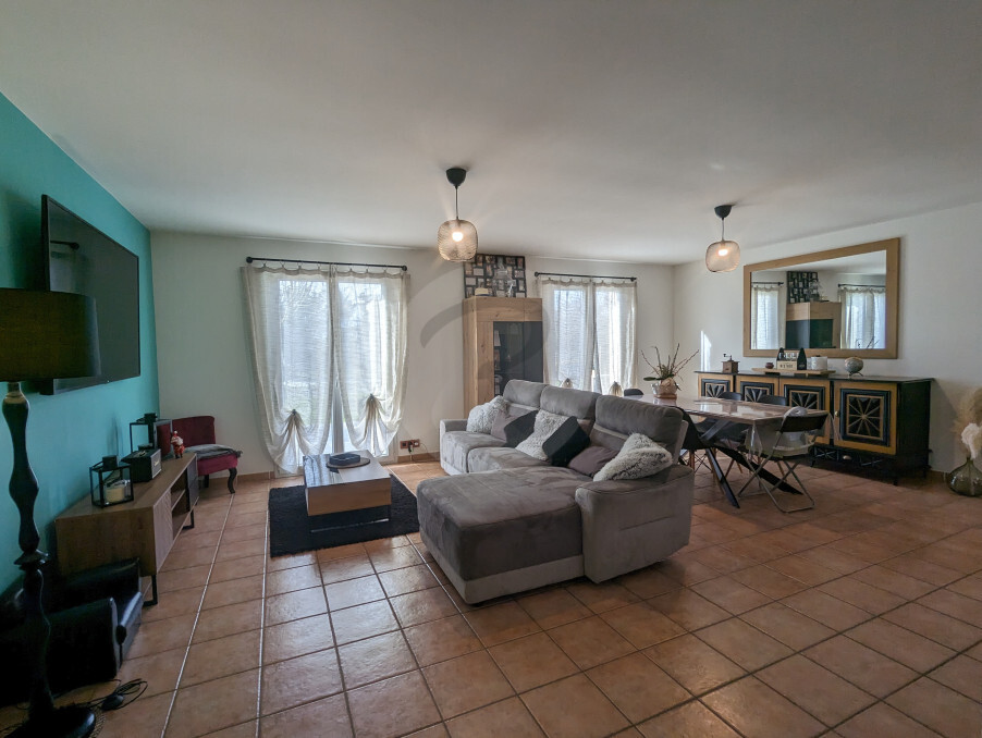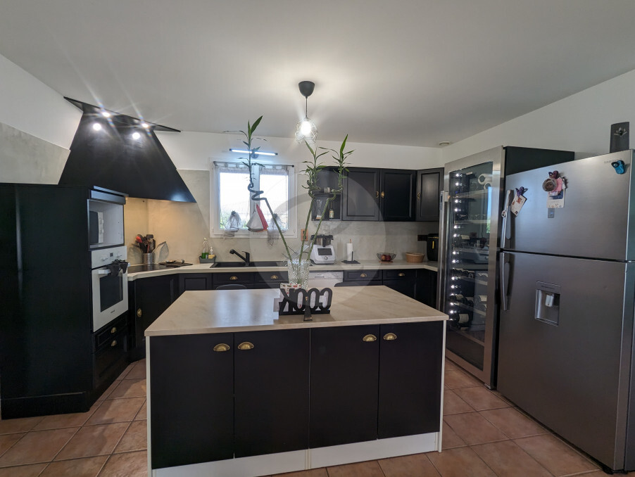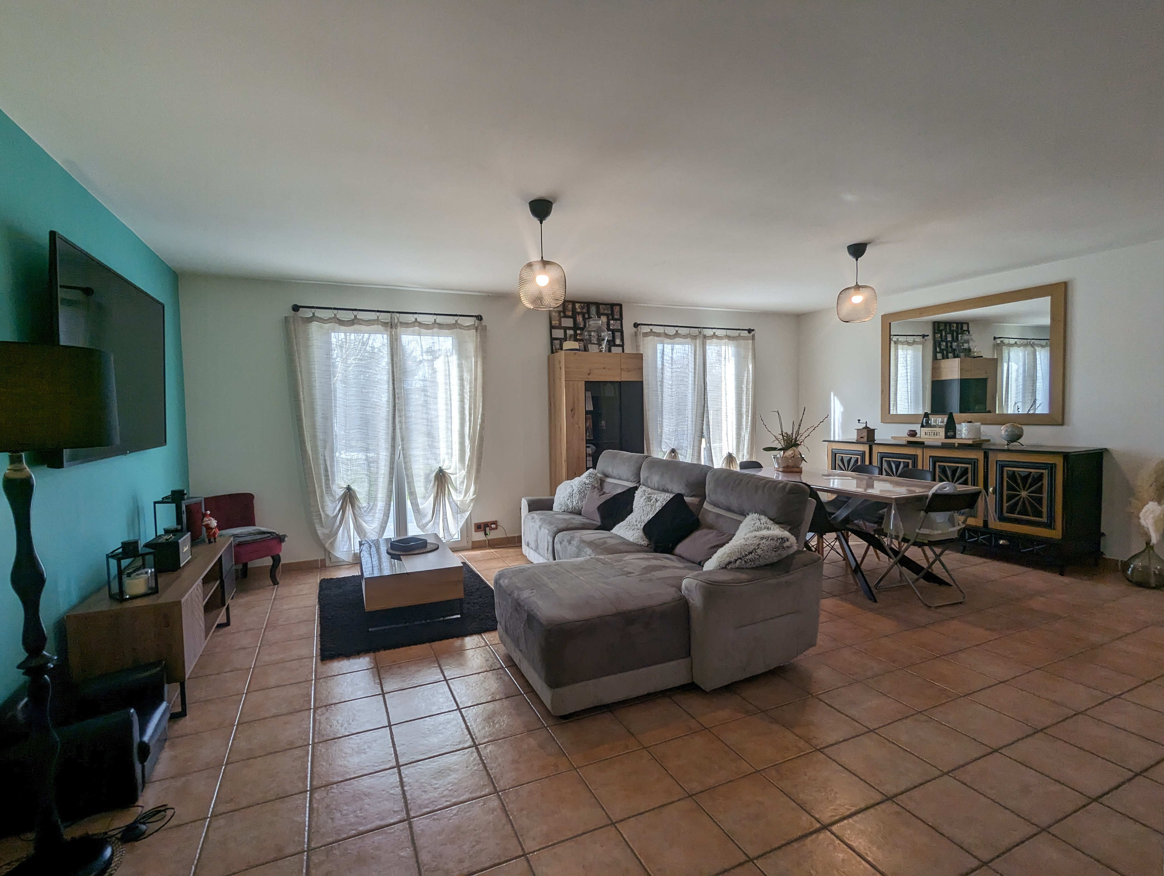 Maison construite en 2002 sur un terrain plat de 2005 m² avec jardin et terrain de pétanque. Elle offre une grande pièce de vie lumineuse avec cuisine ouverte, cellier, buanderie, bureau, et trois chambres avec placards. La salle de bain dispose d'une douche, baignoire et rangements.