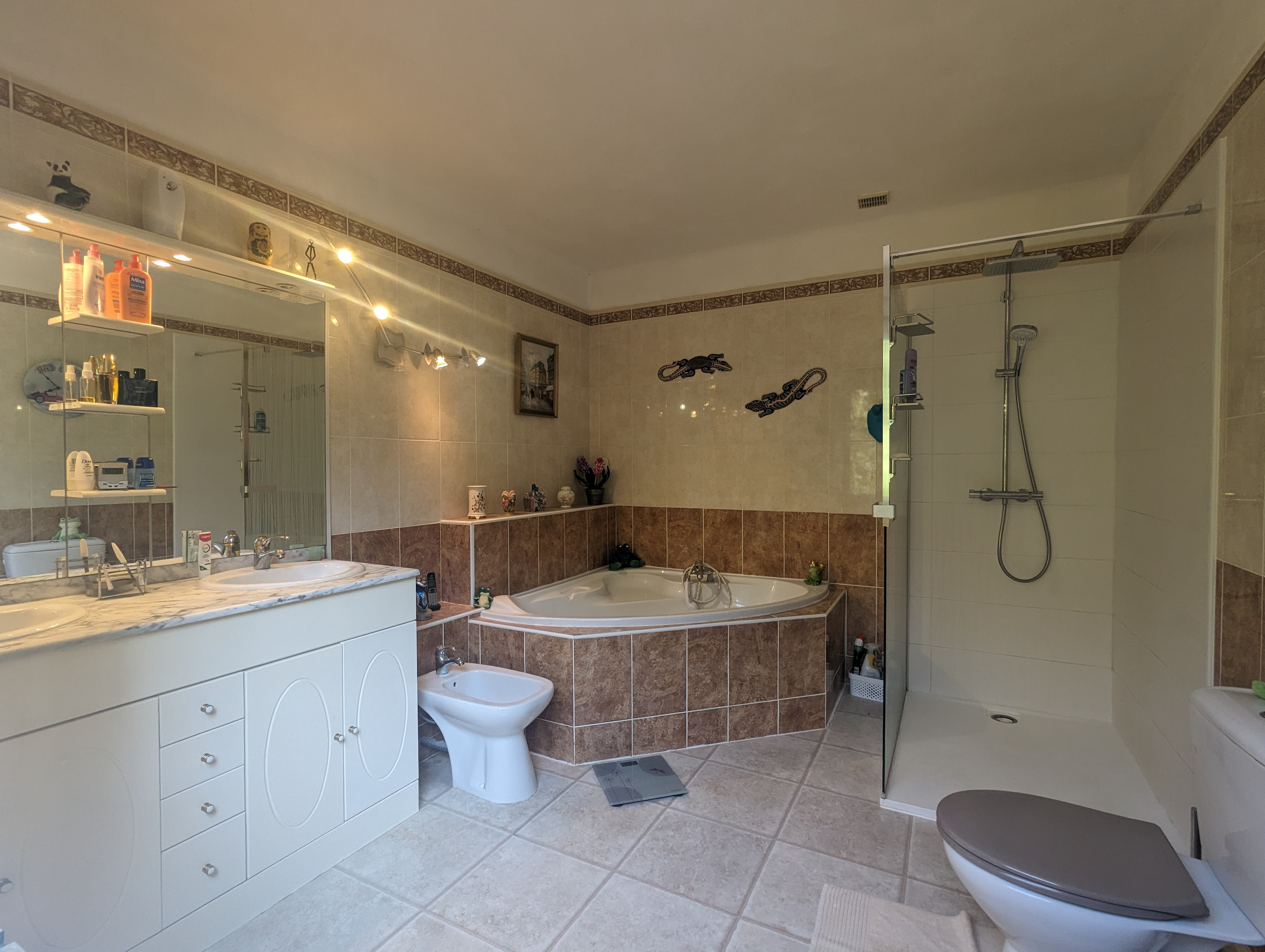 Prestation : double vitrage en aluminium, volets roulants électriques, pompe à chaleur, cumulus thermodynamique, toiture vérifiée, gouttières récentes, avancée de toit en PVC, insert, portail électrique.
