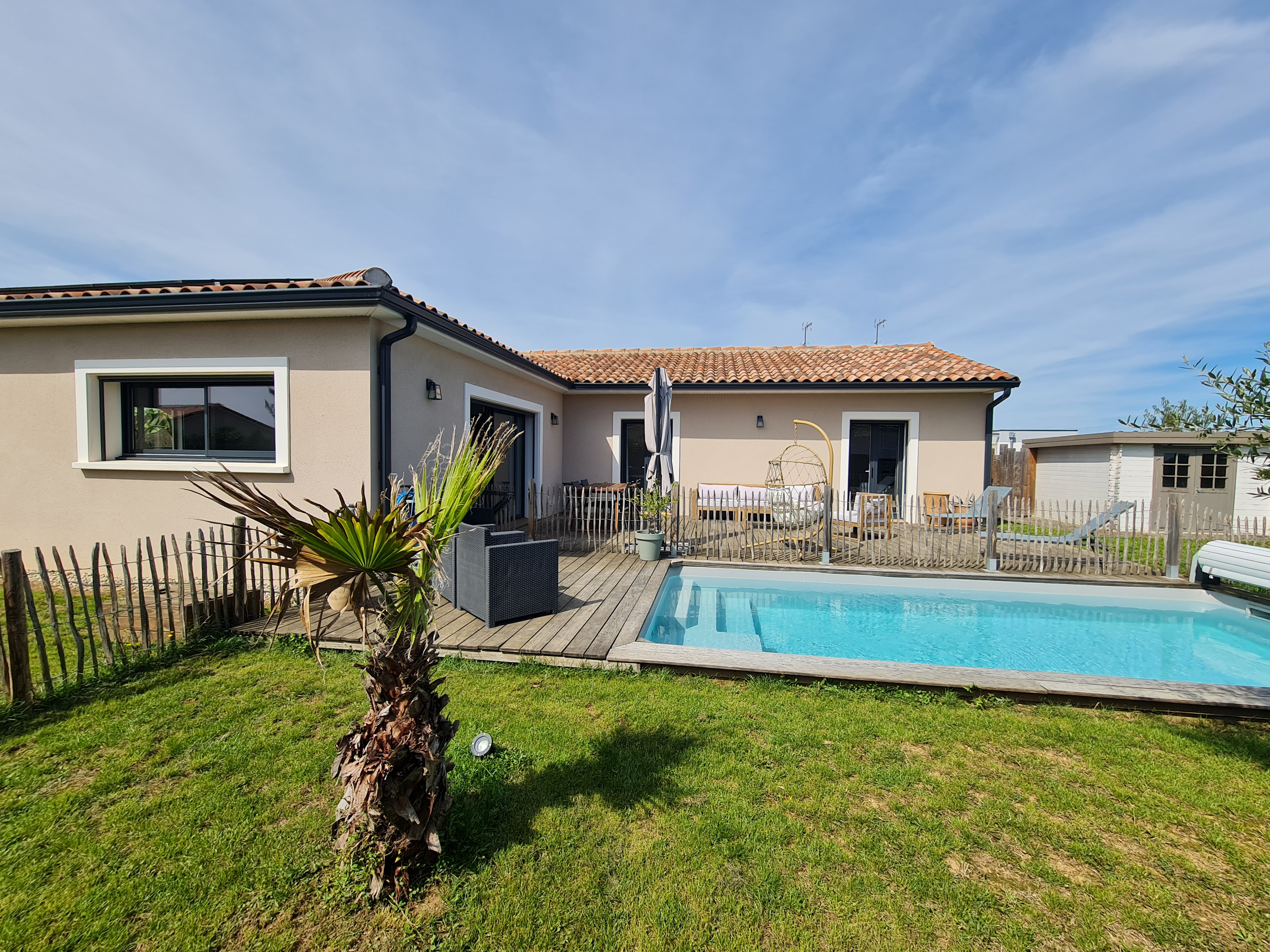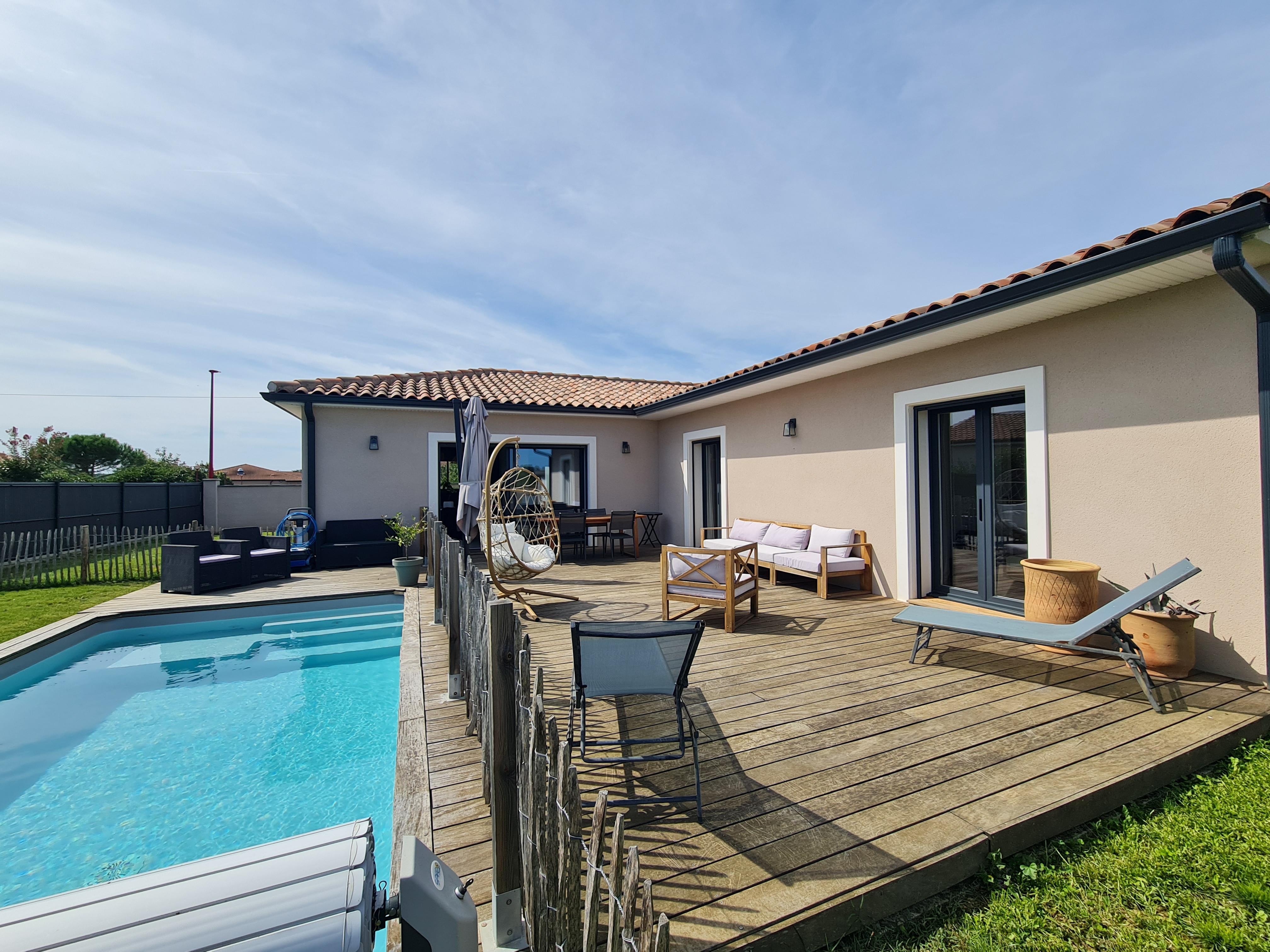 Une piscine ainsi qu'une belle terrasse en bois vous permettront de passer de bons moments à l'extérieur.