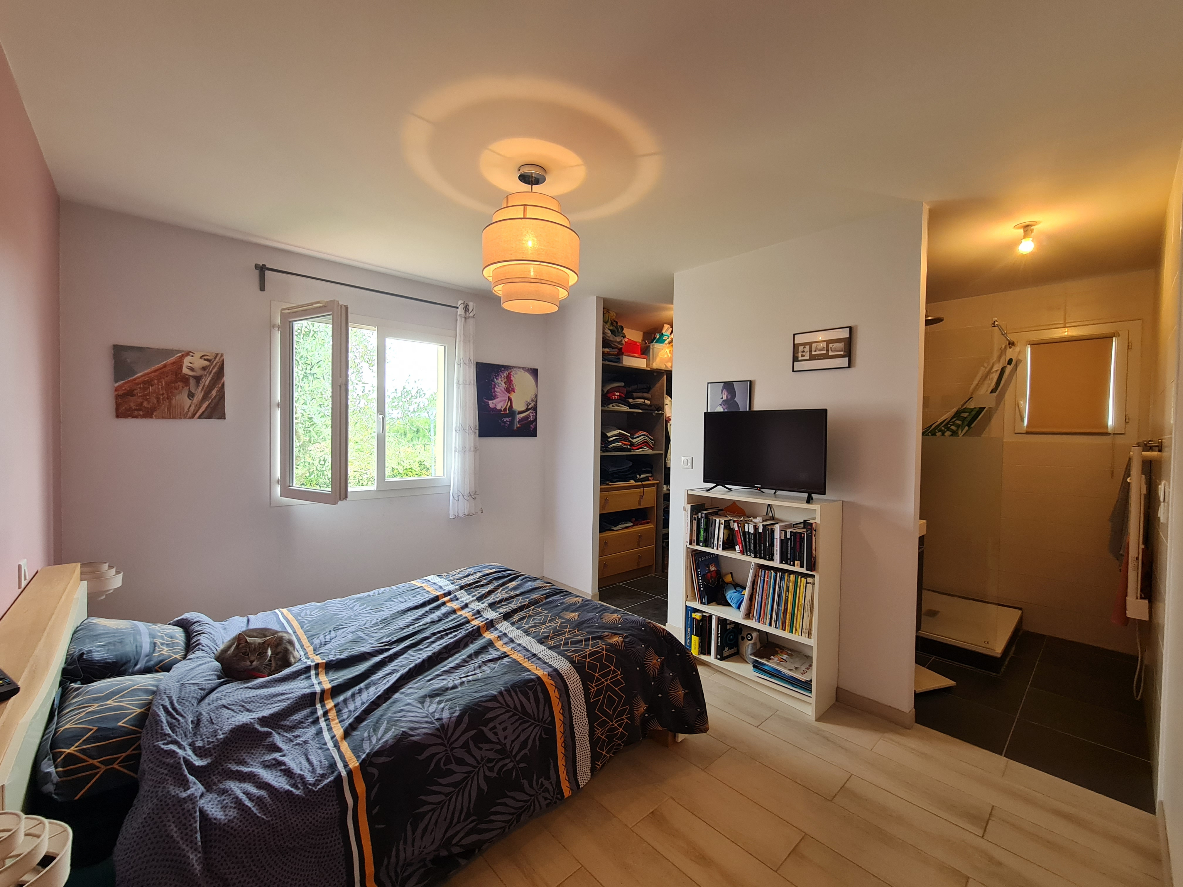 Equipements : Grande baie à galandage dans la pièce de vie, double vitrage, volets roulants électriques, plancher chauffant par pompe à chaleur avec fonction rafraichissant, tout à l'égout.