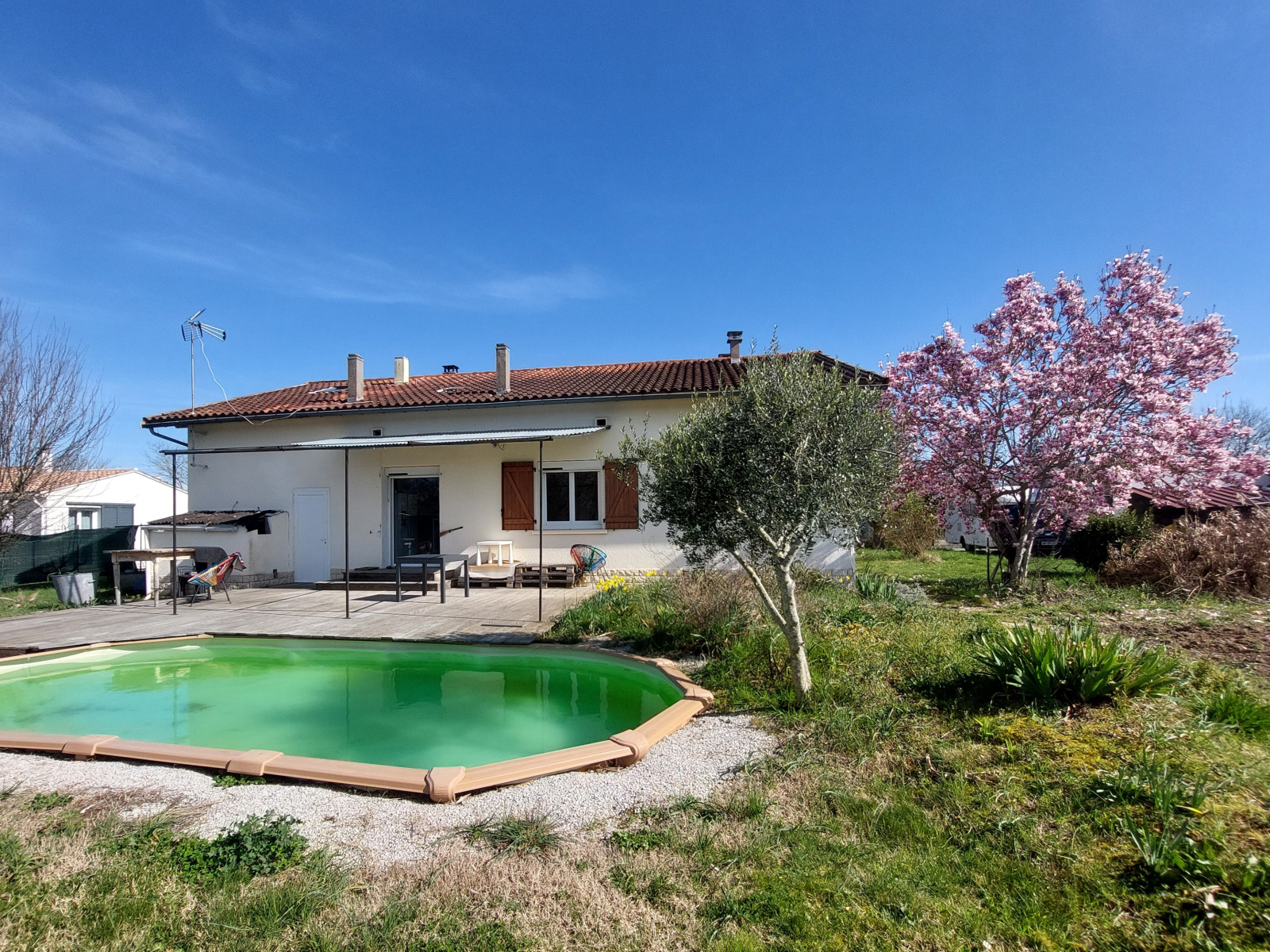 Implantée sur un grand jardin, la propriété bénéficie d’un environnement calme et agréable.