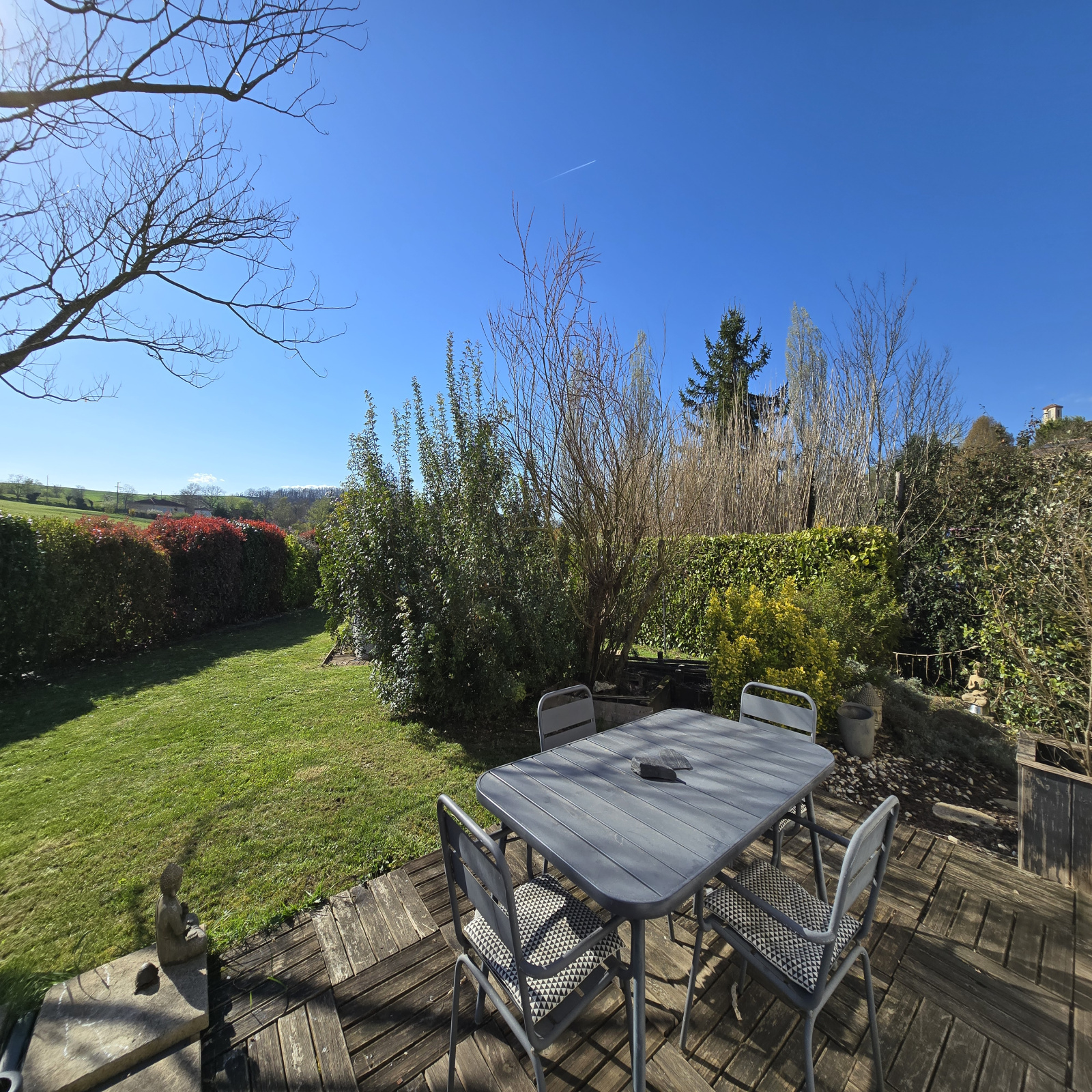 À l’extérieur, vous profiterez d’un jardin agréable, parfaitement adapté aux moments de détente, avec la présence d’un abri de jardin et d’un carport.