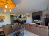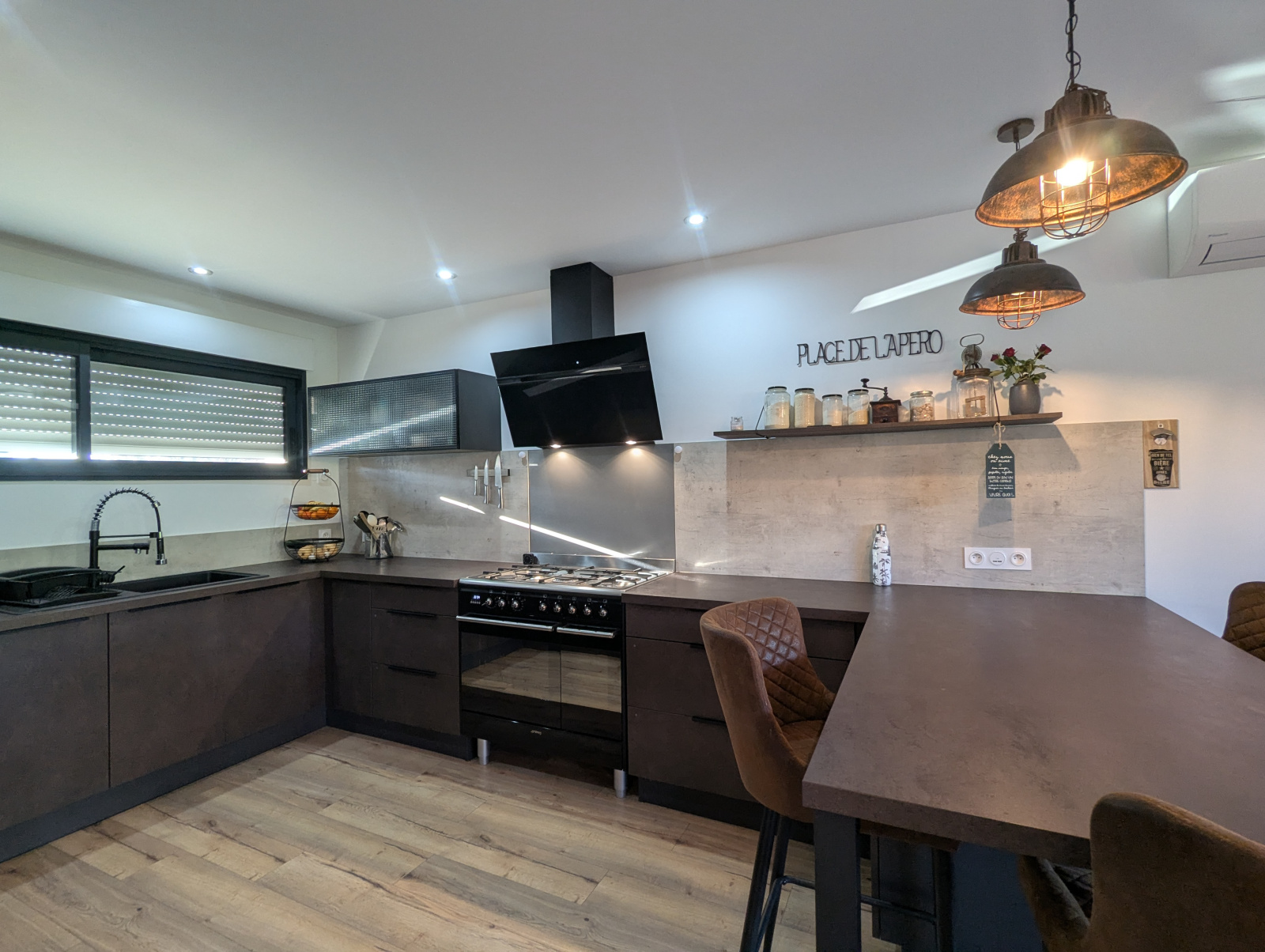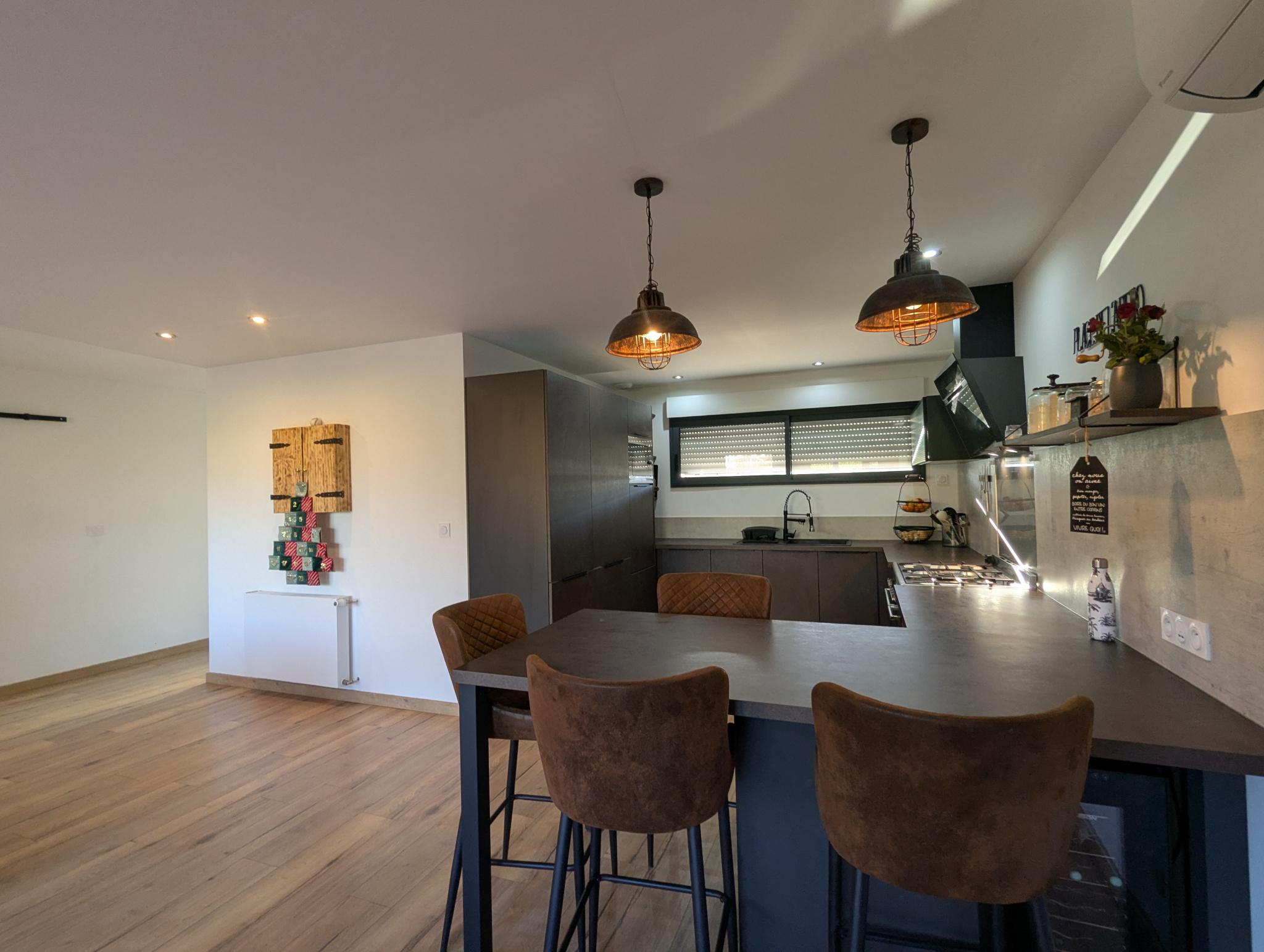 Côté intérieur, on découvre une entrée avec placard, un WC indépendant, puis une belle pièce de vie ouverte, lumineuse et conviviale. La cuisine moderne et qualitative, réalisée avec de beaux matériaux, est accompagnée d’un cellier très pratique.