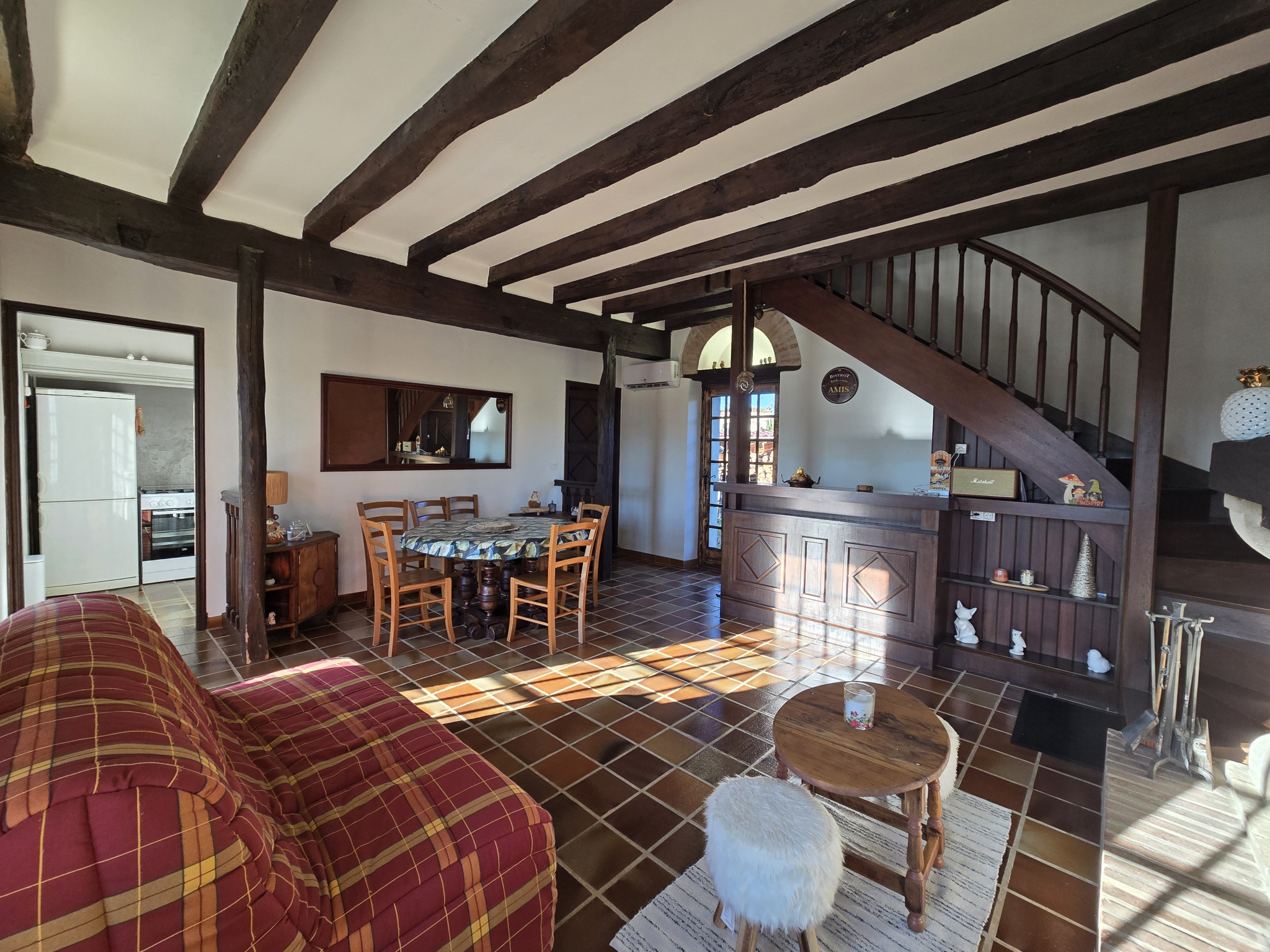 À l’intérieur, la maison se compose :d’une belle pièce de vie chaleureuse avec cheminée,