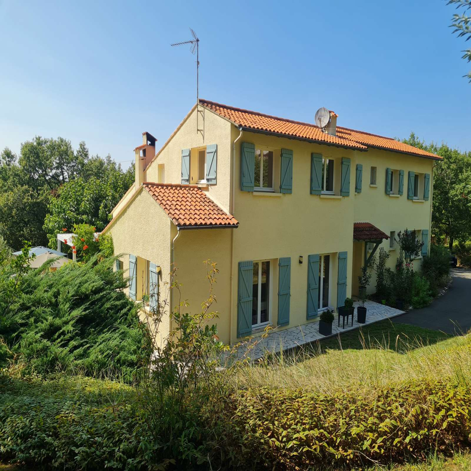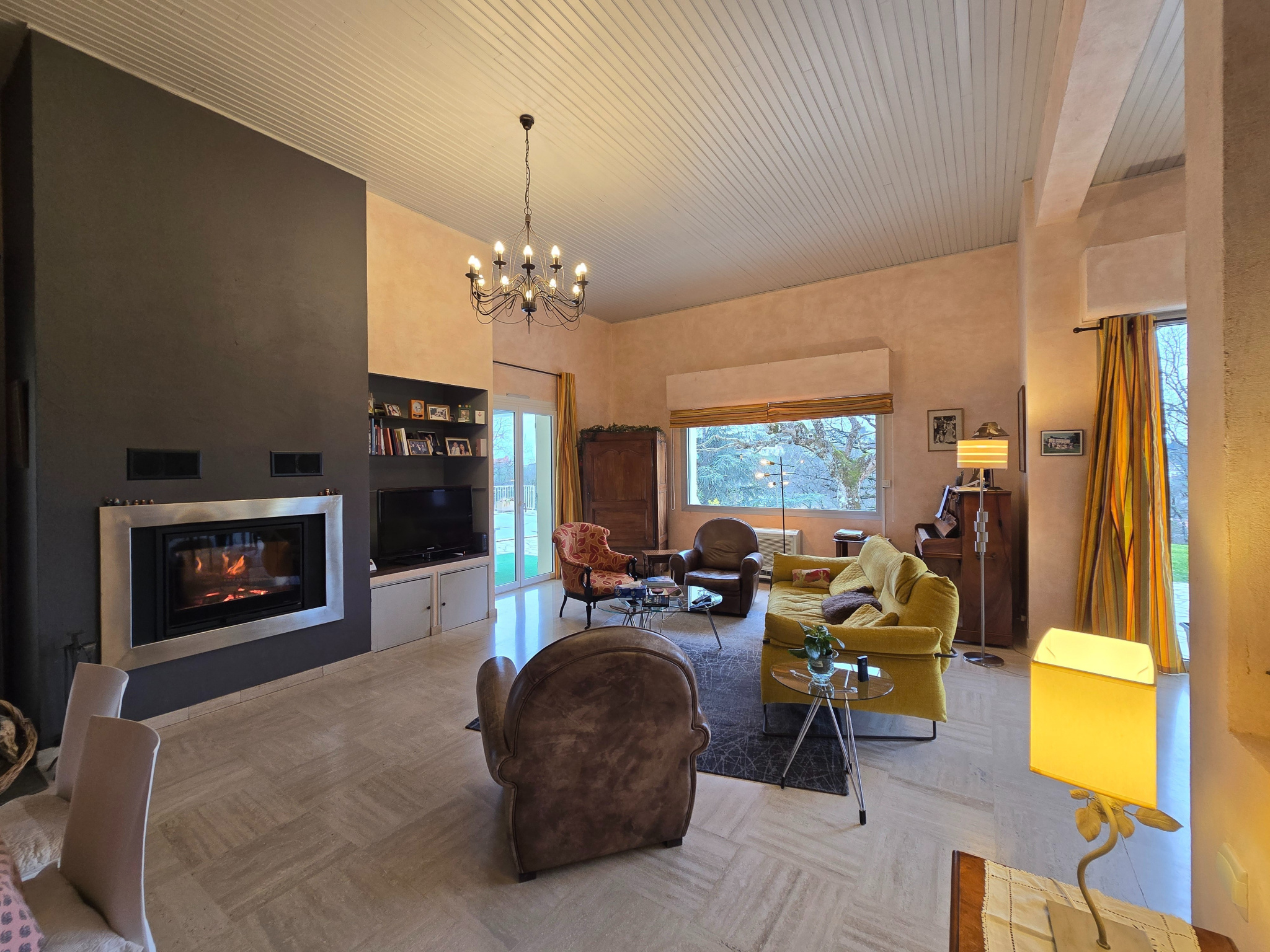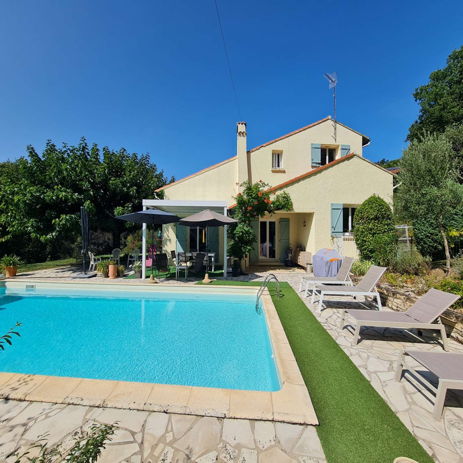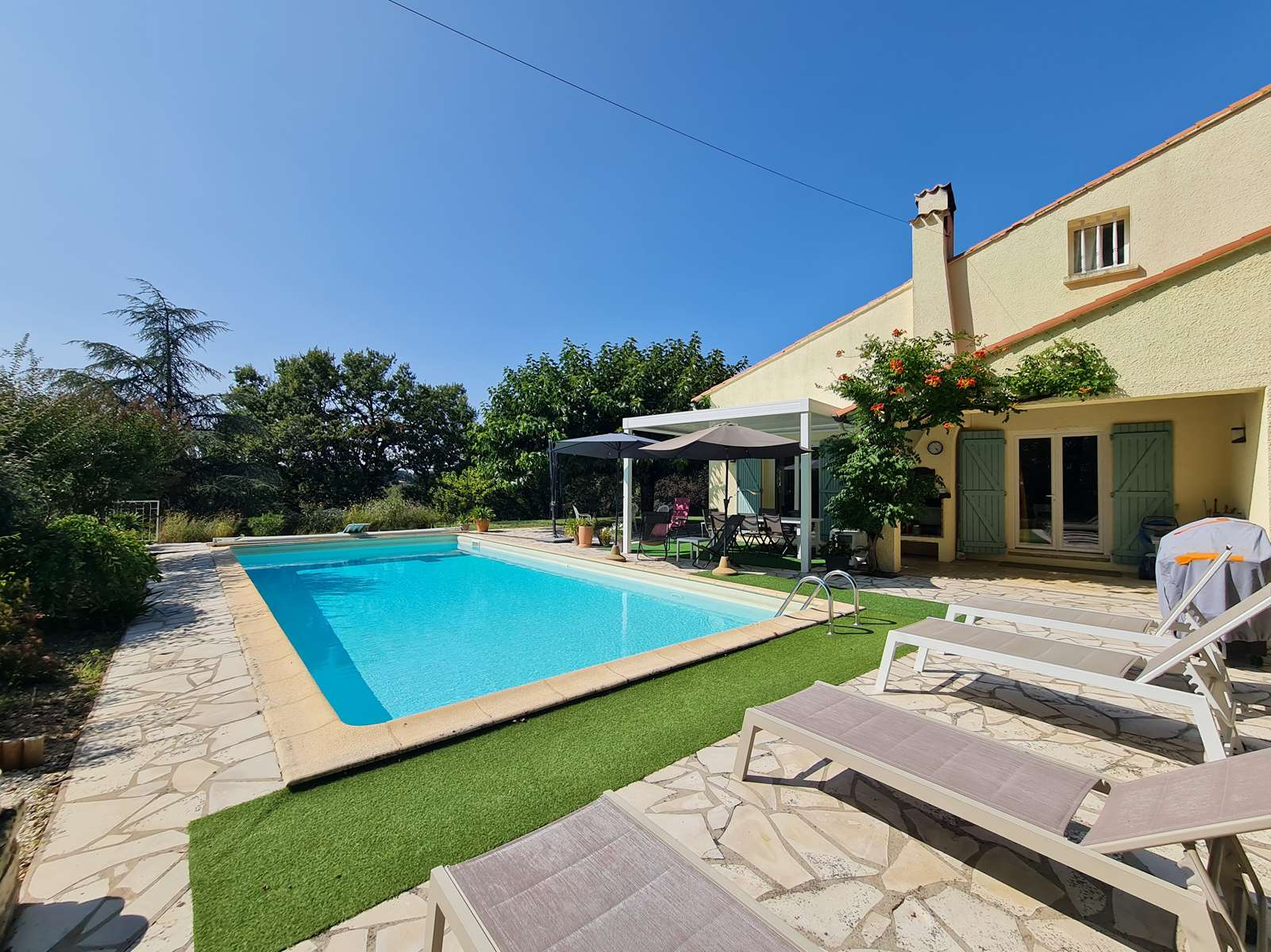 À l’extérieur, la propriété s’inscrit dans un cadre campagne recherché, avec un jardin arboré et une belle piscine, le tout sans aucun vis-à-vis, garantissant calme et intimité.